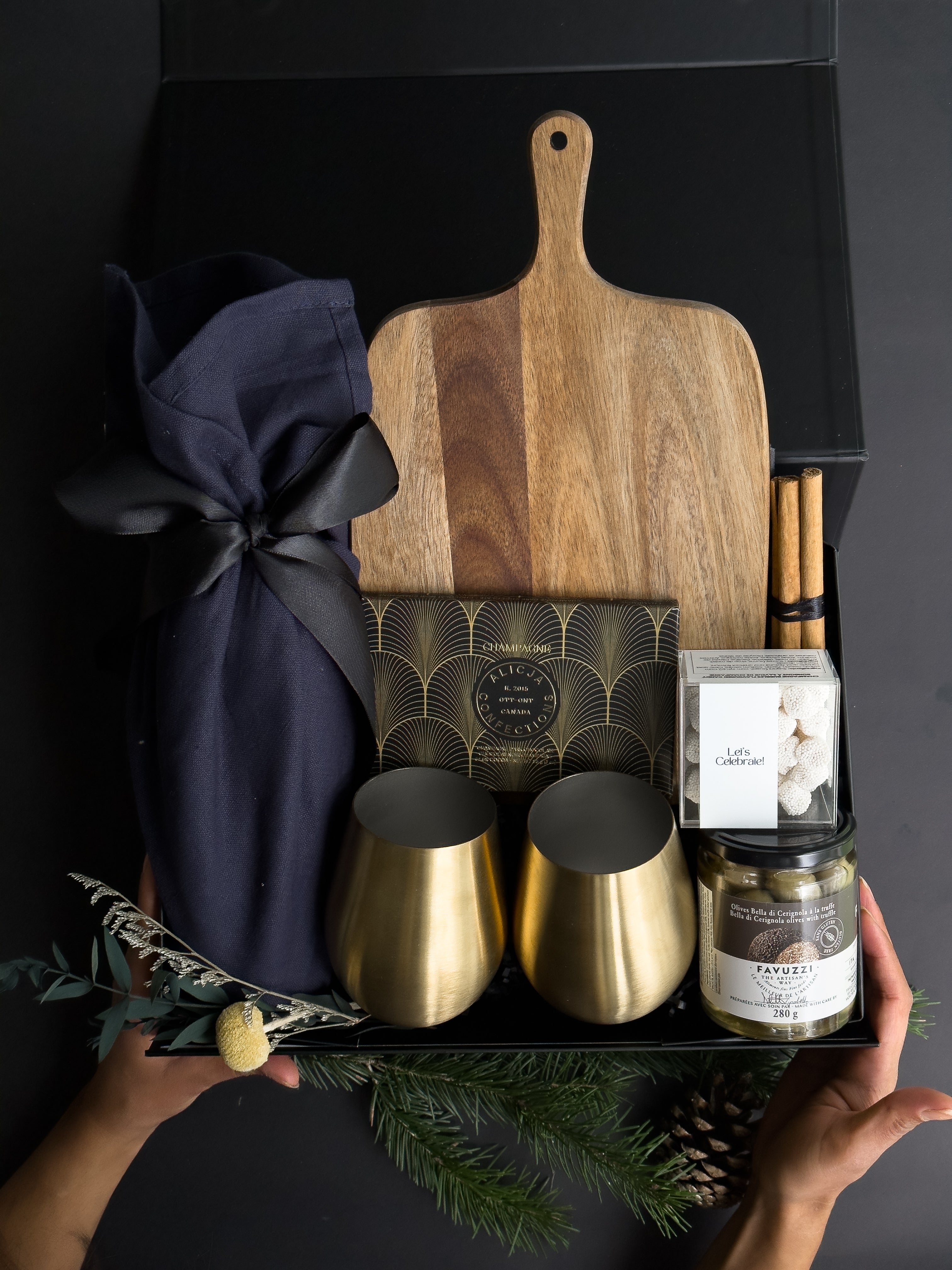 Make every holiday gathering unforgettable with our Big Celebration Gift Box, perfect for fall, Holiday & Christmas celebrations. Thoughtfully curated for special occasions, this luxurious set comes in a sleek black magnetic closure gift box and includes everything needed to elevate any festive moment. From linen-wrapped wine to gourmet treats and elegant accessories, each item is designed to create a memorable and indulgent experience. Whether for corporate gifting or personal celebrations, this box is ideal for sharing joy and creating lasting memories throughout the holiday season. Available for shipping across Vancouver and Canada.