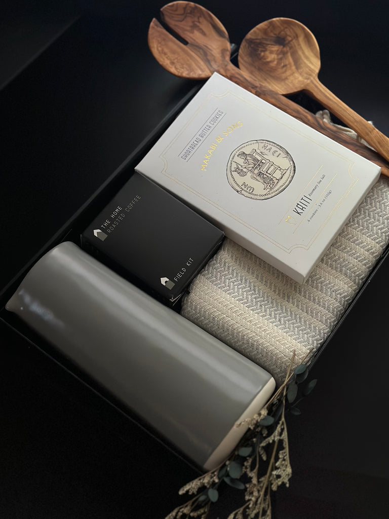 Our new House & Home box a perfect blend of elegance and comfort. This thoughtfully curated collection includes a stylish stoneware carafe, a minimalist cotton tea towel, stunning olive wood salad servers, and a captivating scented candle. Sweeten the experience with rosemary shortbread cookies, and complete the natural charm with a beautiful dried foraged bundle. Each item is handpicked to bring warmth and joy to their new space, making it a delightful housewarming, wedding, or special occasion gift!