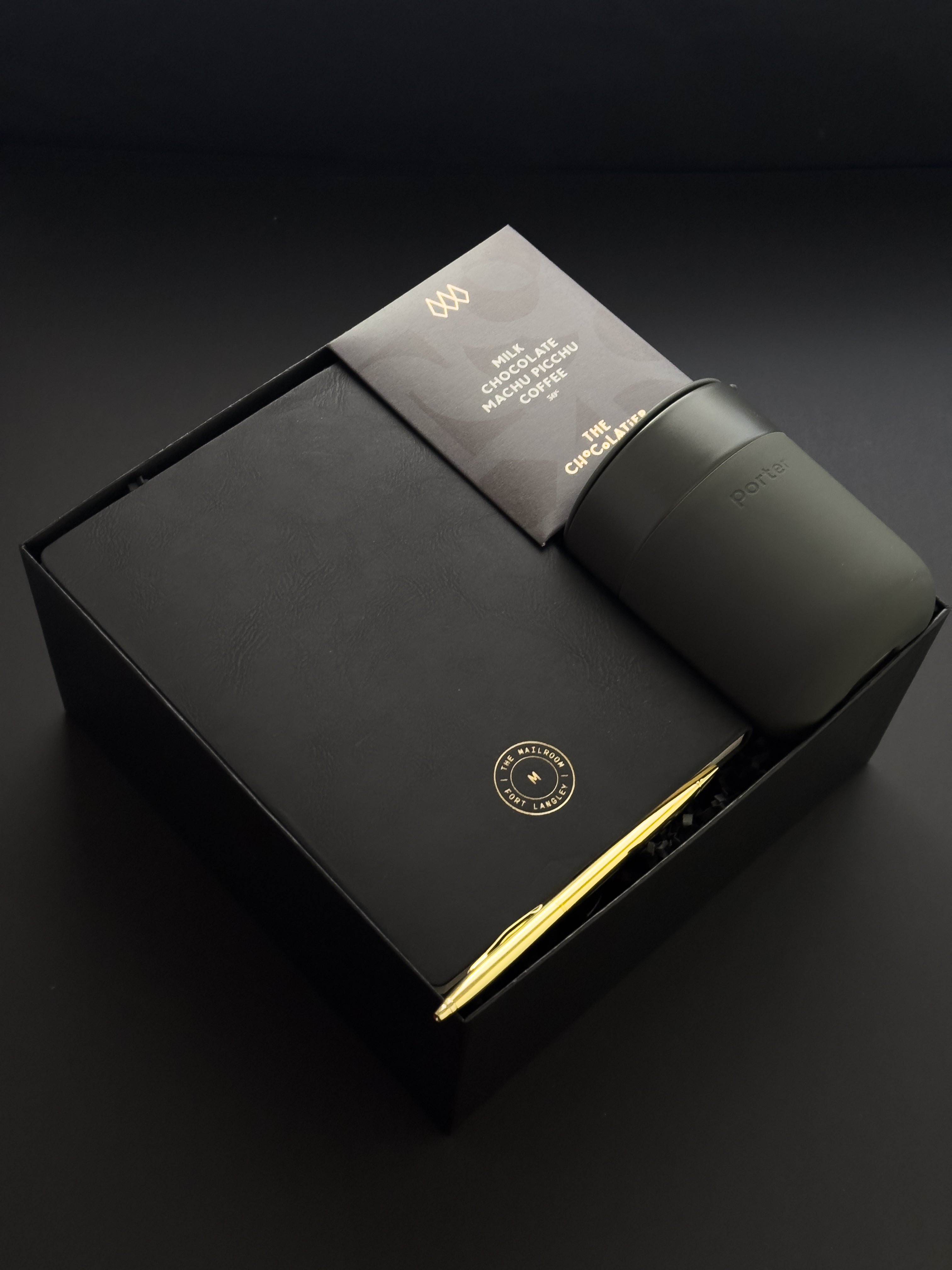 The Desk Essentials Gift Box is a curated collection of premium tools designed to elevate the everyday. A black vegan leather notebook from The Mailroom Fort Langley with pages that invite focus. A gold pen that adds a touch of refinement to every signature. A sleek black ceramic Porter travel mug that keeps coffee at the right temperature through back-to-back meetings. And coffee dark chocolate by The Chocolatier — for the moments between calls when you need something more than another cup of coffee.